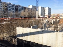 В первом корпусе на 40% выполнены работы по монтажу внешних стен цокольного этажа. На 25% обустроена плита фундамента в подземной парковке, размещенной между первым и вторым корпусом.